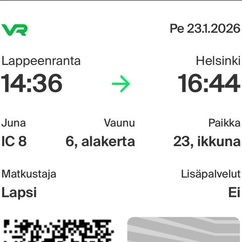 15.1 torstaina junalippu Helsinki-Lappeenranta.