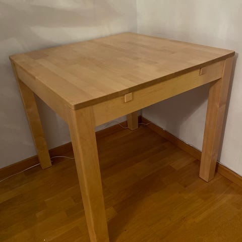 Laulumaa Emilia ruokapöytä 80x80cm, koivua. Jatkopaloille on paikat. Hyväkuntoinen, pinnassa on tavallista käytön jälkeä mutta ei mitään kovin silmäänpistävää.