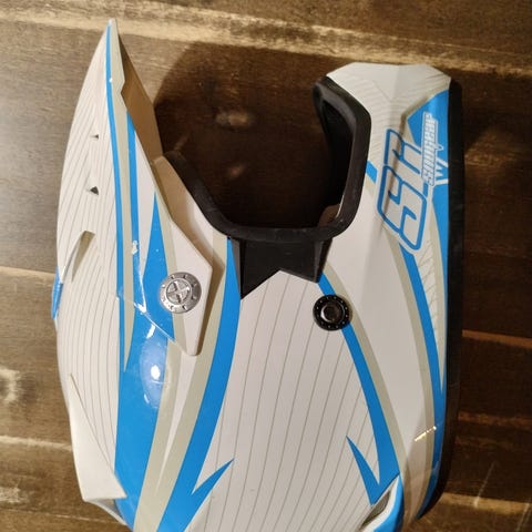 Myydään käytetty kelkkakypärä lapselle. Koko xxs. Visiirin reunasta teipattu halkeama.