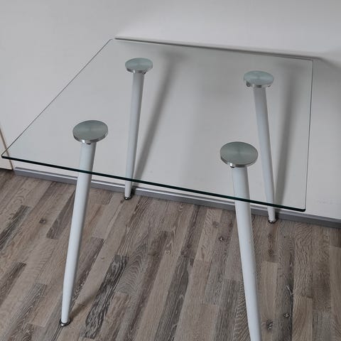 Valkoinen ruokapöytä lasikannella. Metallinen kehikko ja jalat. Pieniä käytönjälkiä lasissa. Vain nouto, Iissä.