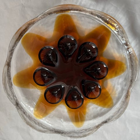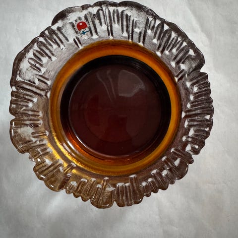 Lasinen kulho, halkaisija noin 24 cm. Väri ruskea ja kirkas. Sopii esimerkiksi tarjoiluun tai koristekäyttöön. Hyvässä kunnossa🌸