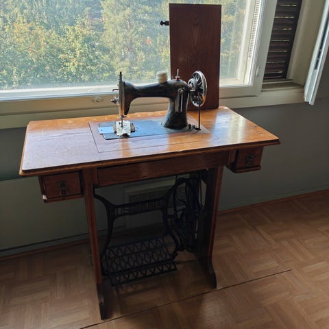 Ompelukone ja pöytä merkkiä Husgvarna.