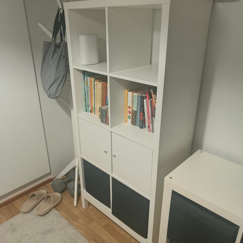 Myydään Ikean kallax hylly. Mustat säilytyskorit kuuluu kauppaan.