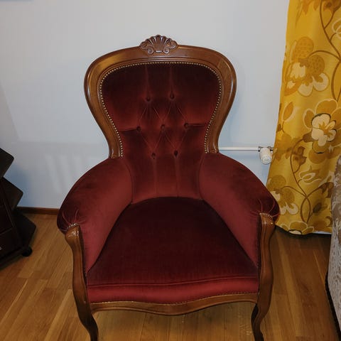 Ruskean sävyinen rokokoo tuoli. Hyvä kuntoinen... Pientä kulumaa jotka näkyy toisen kuvan kukissa.
