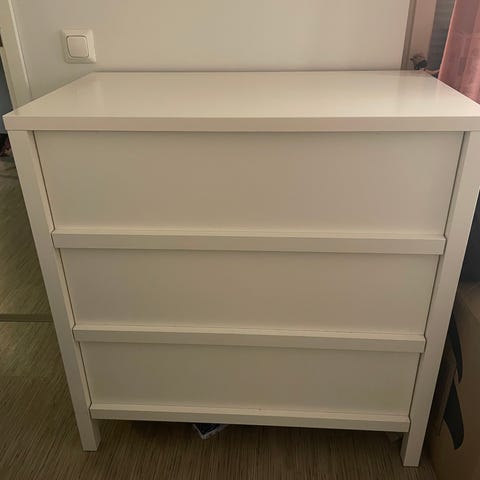 Valkoinen Ikean lipasto kolmella vetolaatikolla. Ehjä ja siisti. Vetimet vaihdettu. Ainut vika kansilevyssä oleva aika huomaamaton tummempi jälki. Nouto Töölöntorilta ja omat kantajat mukaan.