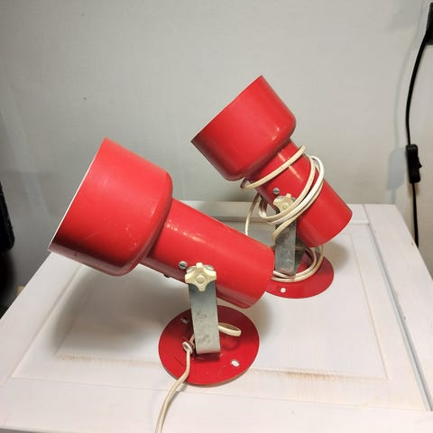 Metalliset Lival-lamput 70-luvulta. Toimivuus testattu. E27-kanta. Maalipinnoissa on vähän kulumia ja metallissa pientä epätasaisuutta.