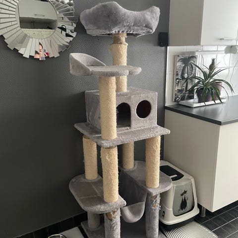 Kissan kiipeilyteline tummansinisellä kankaalla.