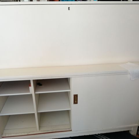 Puuseppä/artesaaniopiskelijan tekemä työpöytä ja laatikosto/lipasto.