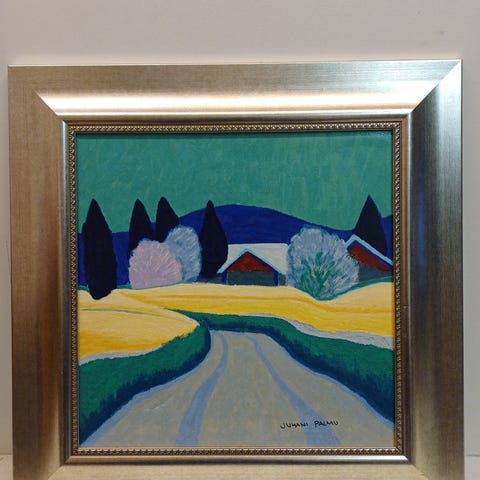 Juhani Palmun terragrafia talvinen pihamaisema. Koko kehyksineen 60 x 76 cm.