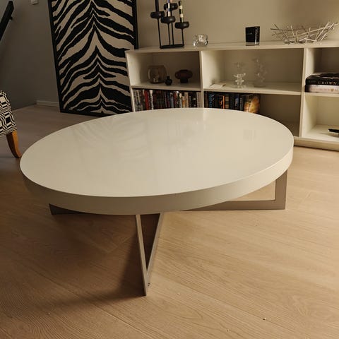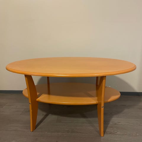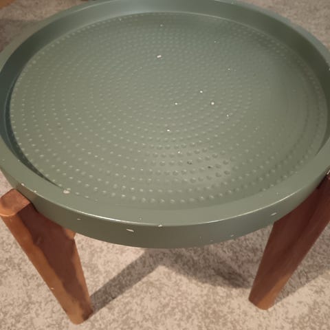 Kansi jonkun verran kuopalla ja siinä tahroja sekä lovia, eli pinta ei ole tasainen. Vaatii siis siistiä ilmettä varten hiomisen ja öljyämisen. Teräsjalka moitteeton. Kansi ruuveilla kiinni jalassa.