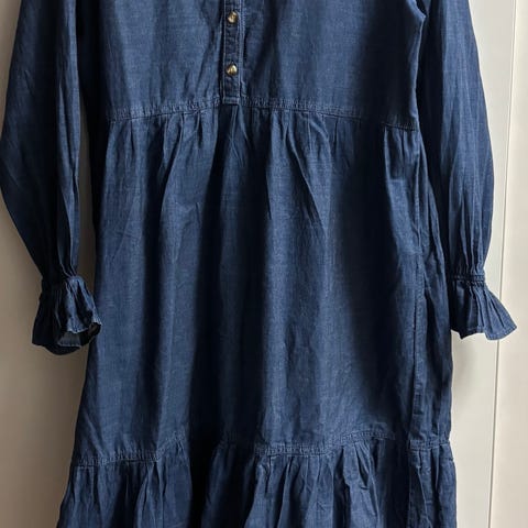 Denim tyyppistä puuvillakangasta oleva mekko musta tai hyvin tummansininen. Napitus edessä vyötärölle saakka. Vyötärön ympärys 50cm. Olen 170cm pitkä, joten mekko on täyspitkä. Ei toridiiliä, mutta voin lähettää ostajan maksaessa postimaksun. Ei pitkiä varauksia.