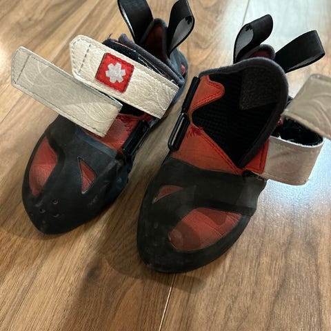 Olleet tyttärellä käytössä reilun vuoden enimmäkseen sisäkiipeilyssä. Kiipeilykertoja tullut noin 30. Käytetty sukkien kanssa. Tyttären jalka nyt 26 ja on pohjaa vasten yhtä pitkä kuin kenkä (jalka suora, kenkä käyrä). Vaatii kuitenkin aika päättäväisen lapsen, joka survoo 37 jalan tuohon kenkään, aikuiselle koko lienee oikea, kyseessä kuitenkin melko progressiivinen kenkä.