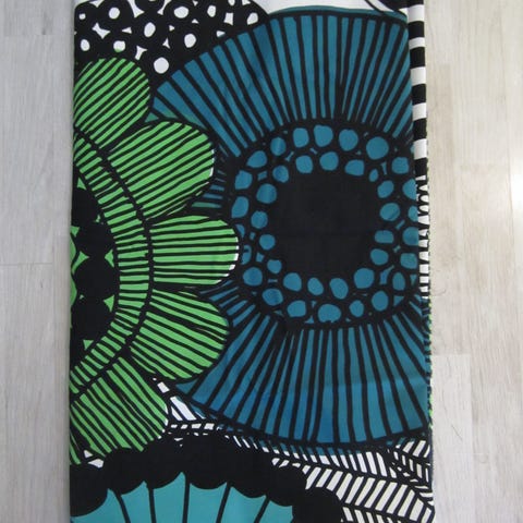 Marimekko siirtolapuutarha kangas, 100% puuvillaa. B laatua missä toistuva virhe kukan kohdalla mistä kuvat napattu. Itse ostaessa koin että virhe ei haittaa villissä kuosissa. Kangas paloja on 3 mitkä kuvio kohdistettu. Jokaisen pituus on 3,20m eli yhteensä kangasta 9,60m. Piti tulla kotiin verhoiksi mutta värit eivät sopineetkaan sisustukseen. Sopii esimerkiksi verhoiluun tai sisustustekstiilikäyttöön. Myyn nämä kaikki 3 palaa paketissa en erikseen.