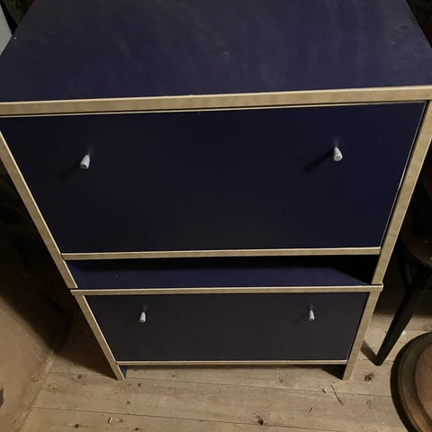 Ikean valkoinen lipasto. Muuten hyvässä kunnossa, mutta keskimmäisen laatikon päältä puuttuu valkoinen irto lista.