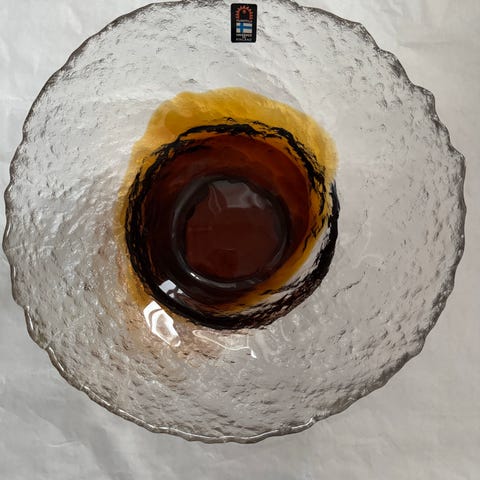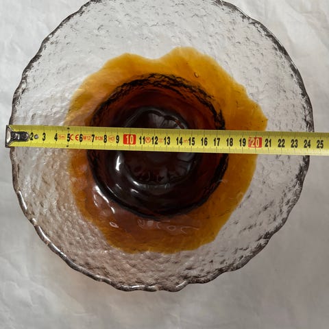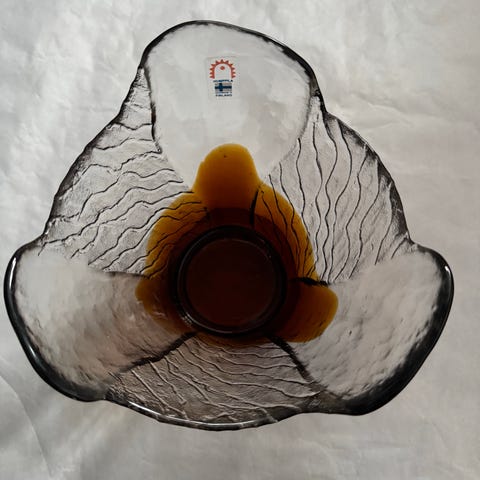 Humppilan lasinen kulho 1979-luku. Kulho on ruskean sävyinen ja valmistettu lasista. Soveltuu monipuoliseen käyttöön keittiössä ja pöydän kattauksessa.
