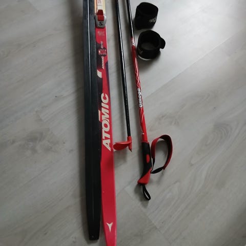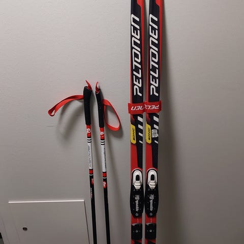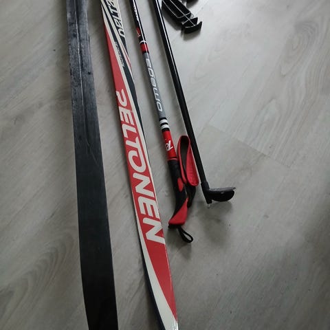 Taivahan vanhat mutta käyttökuntoiset 157 cm Fischerit NNN-siteellä. Hiihtosauvat 120 cm kaveriksi eli noin 140-senttisen hiihtäjän paketti.