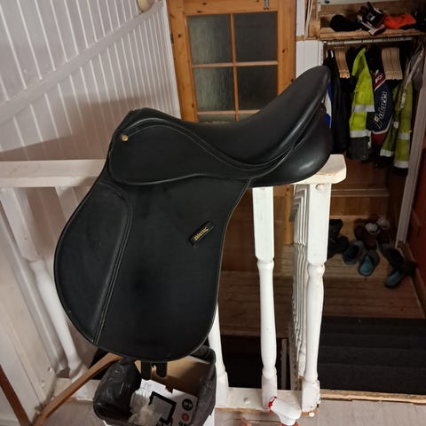 Paljon käytetty, mutta kohtuukuntoinen Wintec 17" penkillä. Villatoppaus, vastinhihnoista reunimmaiset vaihdettu nahkaisiin. Valkoinen kaari sisällä.