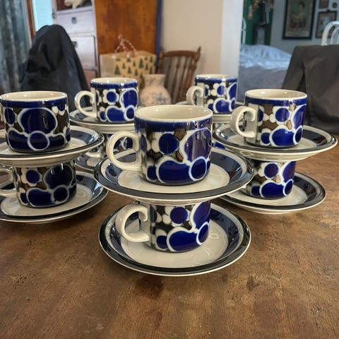 Saara-sarjan kuppi ja lautanen, kupin korkeus n. 7 cm. Löytyy viisi paria. Hinta yhdestä.