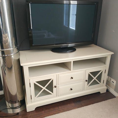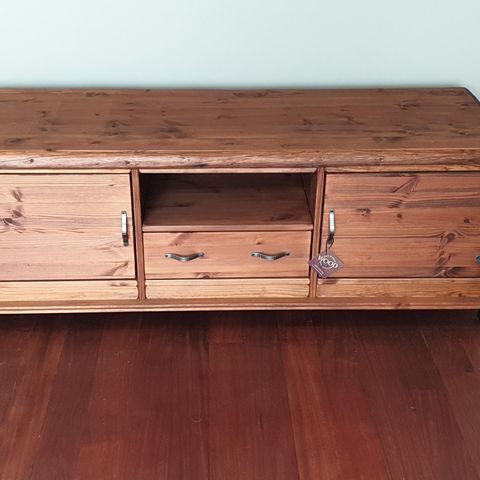 Massiivipuinen, tukeva tv- taso / sivutaso kahdella vetolaatikolla. Kunto erinomainen. Nouto paikanpäältä.