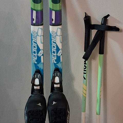 Myydään sukset 120 cm, monot 31, sauvat 85 cm ( toisesta sauvasta lähtenyt pikku pala pois, toimii vielä)