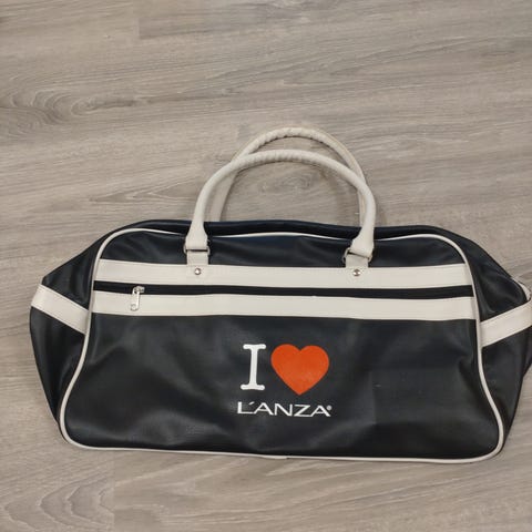 Laukussa on tilava pääosasto ja erilliset sivutaskut. Mukana irrotettava ja säädettävä olkahihna. Väri tummansininen vaalein yksityiskohdin. Korkeus 42 cm pituus 70 cm leveys pohjasta 30 cm