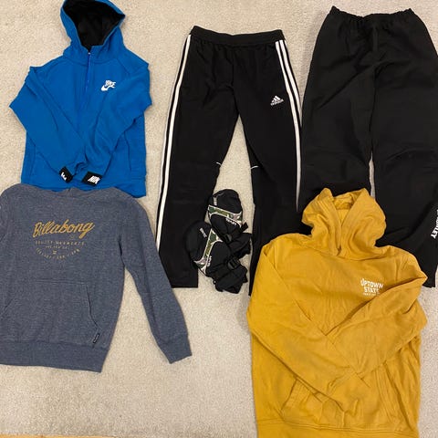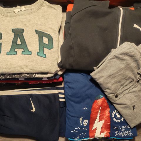 5 kpl collegehousuja, 8 kpl collegepuseroa/hupparia ja 2 t-paitaa. Kooltaan 146/152. Mustissa kokonaiset tracksuitit (Zara, Björn Borg, Adidas). Hyvässä käytetyssä kunnossa, Adidas collegen hihassa pieni maalitahra. Björn Borg ja Calvin Klein hupullisia, muut ilman huppua.