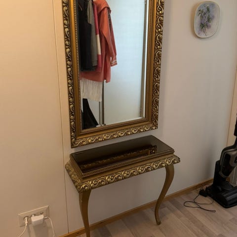 Tässä upea ja näyttävä Finnmirror kultakehyspeili kauniin koristeluin uuteen kotiin. Meillä uudessa kodissa ei löydä paikkaansa joten löytyisikö uusi koti juuri sinun luota? Peilin mitat: korkeus 166cm, leveys 66cm. Takana tulevat kiinnityskoukut. Mitään merkintöjä, tarraa ei löydy. Peili on todella kaunis ja siistikuntoinen ja myös painava joten vain Nouto ja käteismaksu:)