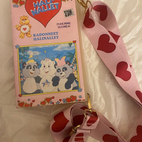 Erikoisuus! Aristokatit VHS-kasetin kotelosta tehty käsilaukku. Helminauhahihna. Postikulut lisätään hintaan.