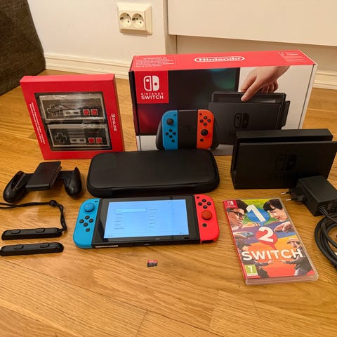 Nintendo Switch konsoli, kannettava ja kotikäyttöön soveltuva pelilaite. Mukana laitteen telakka, laturi, hdmi kaapeli, Joy-Con ohjaimet ja pari peliä(supermario 3d world, bowser's fury ja supermario maker 2. Hp 150/tarjous