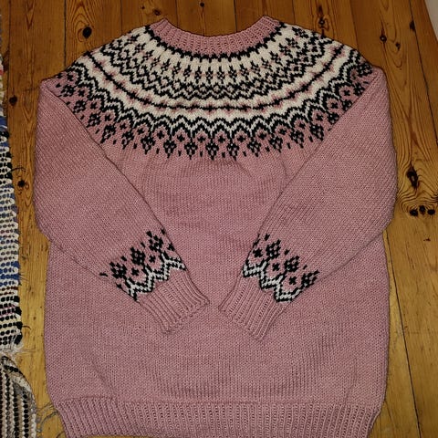 Uusi,käsin neulottu Novitan 7-veljesta langasta.80%villaa, 20%polyamidia.Konepestävä 40asteessa,tasokuivaus. Huomaa kauniit resorit kaula-aukossa,hihansuissa ja helmassa.Mitat:kai-kai 62cm, kai-helma 42cm, kai-ranne 50cm, olka-helma 66cm.