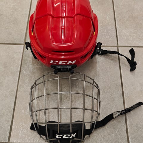 Kypärässä on metallinen kasvosuoja, leukasuoja ja sisäpehmusteet suojaamaan päätä jääkiekkoilussa. Hyvä käytetty kunto.