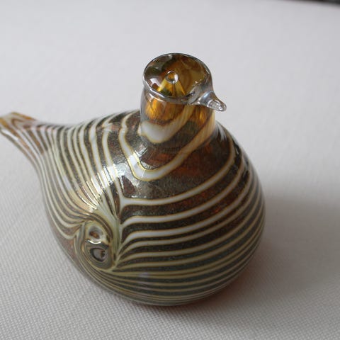 Iittala Birds by Toikka lasilintu. Lasista valmistettu koriste-esine, jossa on vihreän ja mustan raitainen kuviointi sekä kirkas pääosa.