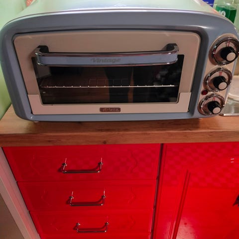 Ariete Vintage Miniuuni sininen. Kompakti pöytämalli, jossa on lasiluukku ja kolme säätönuppia lämmön ja toiminnon hallintaan. Sopii pienten ruokamäärien paistamiseen ja lämmittämiseen.
