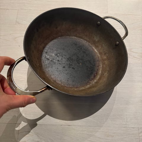 Tasainen lämmönjako. Reilun kokoinen ikuinen hiiliteräspannu. Pinnasta hiottu vanhat rasvapoltot pois.