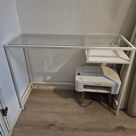 Lasinen työpöytä metallijaloilla.