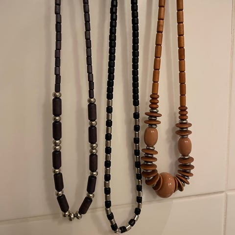 Aarikan vaaleanruskeat näyttävät puuhelmet joustavassa ketjussa, pituus n. 60 cm. Suurimman helmen halkaisija n. 3 cm. Kuin uudet.