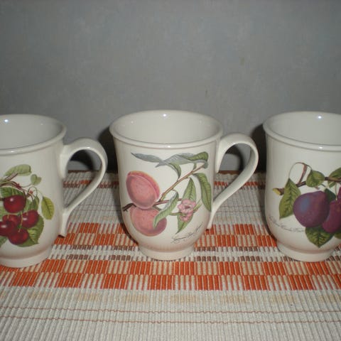 Kaunis kuppi teen hauduttajalle. Kupissa kolme osaa: kuppi, siivilä ja kansi, ja myös kolme erilaista, kaunista kuvitusta. Englantilaista posliinia, Portmeirionin Pomona-sarjaa. Täysin käyttämätön, on ollut vain hyllyssä koristeena.