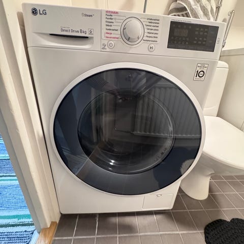 LG edestä täytettävä pesukone valkoinen väri. Pesukoneessa on digitaalinen näyttö ja pyörivä valitsin eri pesuohjelmille. Soveltuu kotitalouskäyttöön vaatteiden pesuun.