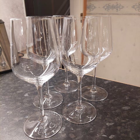 Myydään kuvassa näkyvät viini yms lasit. Vain nouto Kuokkalasta.
