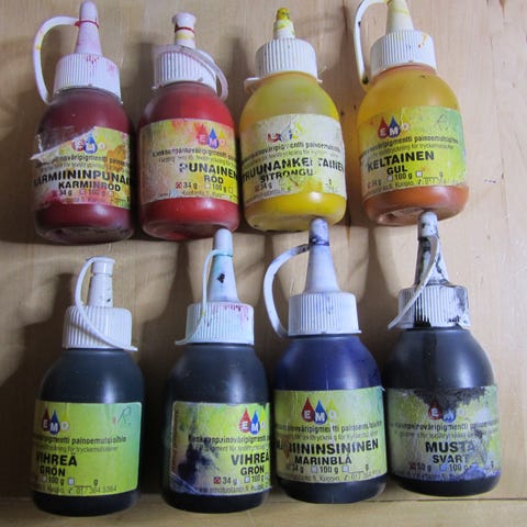 Käytetyt akryylivärit, pitää lisätä vettä niin toimivat.