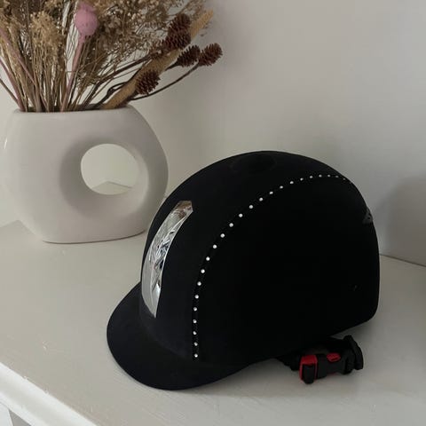 Equitare ratsastuskypärä musta kokoa 55, jossa koristeelliset niitit ja koristeet. Kypärässä on pehmustettu sisusta ja säädettävä hihna. Kypärä täysin ehjä ja hyvässä kunnossa!