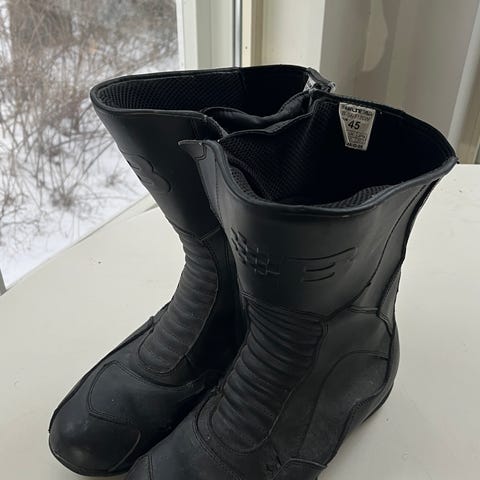 Bilteman ajokengät, jotka eivät juuri uutta häpeä. Kuvissa varastoinnissa tullutta pölyä. Saappaiden koko 38.