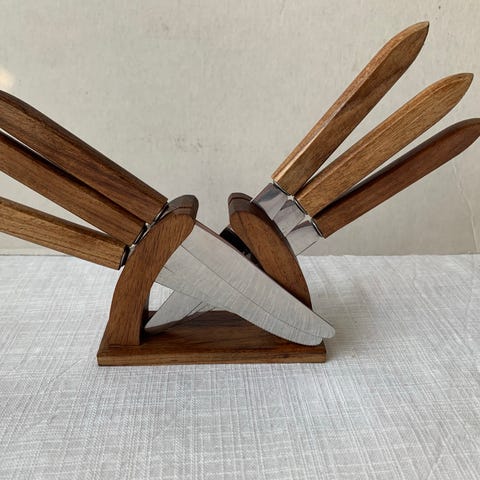 Söpö omenanmuotoinen veitsiteline. Veitsiteline on 90- luvulta. Telineeseen kuuluu 6 kpl hedelmäveistä. Veitset ovat terävät mutta yksi veiti on vähän löysä varresta.