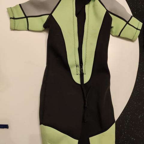 Neoprene Lasten märkäpuku, materiaali 90% neopreeni ja 10% nylon jersey, koko 12. Märkäpuku on varustettu selkävetoketjulla ja vahvistetuilla polviosilla.