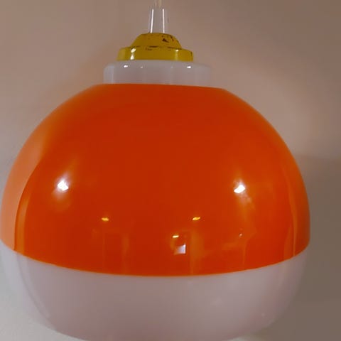 Retro puna-valkea kattovalaisin. Valkoinen kupu lasia, punainen varjostin peltiä. Erittäin siistissä kunnossa.
