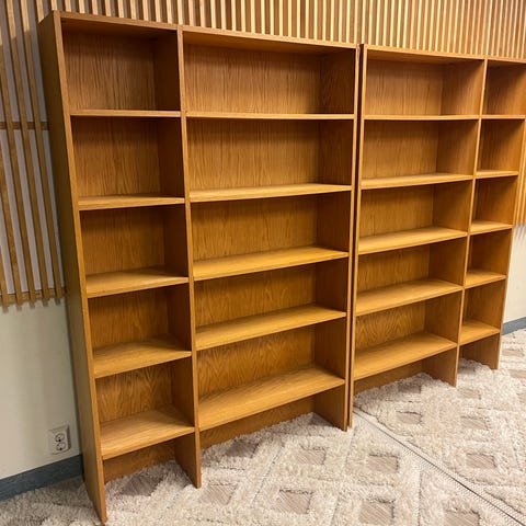 Myyntiin kaksi vintage hyllykköä, saa kiinni toisiinsa mutta voi pitää myös erillään. Myyn mieluiten parina eli hinta on yhteishinta. Yhden hyllyn mitat: leveys 79.5cm, syvyys 23cm, korkeus 129cm.