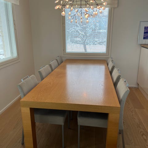 Myydään muuton myötä tarpeettomaksi jäänyt laadukas kotimainen ja erittäin tukevarunkoinen Kaanin Jazz ruokaryhmä, pöytä + 6kpl valkoisella nahalla verhoiltua tuolia. Pöydän koko 93cm × 184cm. Päydän pinnassa käytön jälkeä, sen voi halutessaan hioa ja käsitellä uudestaan. Myös tuolien nahkaverhoiluissa käytön jälkiä. Jazz pöytä soveltuu paitsi ruokailu-, myös neuvottelu-, työ- ja kirjoituspöydäksi. Tästä osaavalle kädentaitajalle edullisesti laadukas ruokaryhmä. Uusi samanlainen setti n. 5400€.