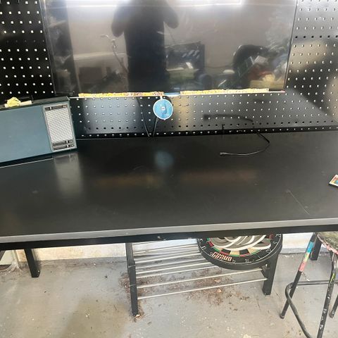 Raskas ja hyväkuntoinen raskaampiin töihin tarkoitettu perustyöpöytä, jonka korkeus on säädettävissä.