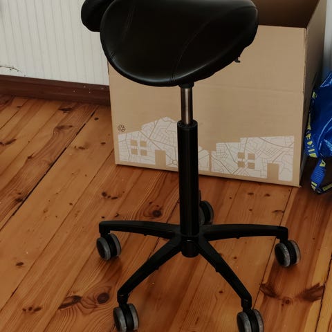 Satulatuoli mustalla istuimella ja kromatulla metallijalustalla. Tuolissa on viisi pyörää, jotka helpottavat liikkumista. Soveltuu esimerkiksi työpisteelle tai meikkauspöydän ääreen.