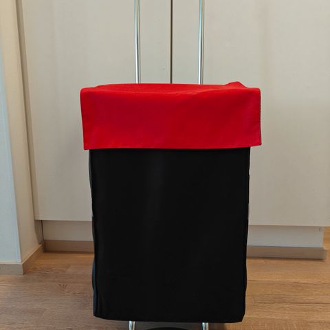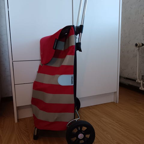 Andersen ostoskärry sininen kangasrunko ja punainen ruutukuvio. Kärryssä on vetokahva ja suuret pyörät, jotka helpottavat kuljetusta. Soveltuu ostosten ja tavaroiden kuljettamiseen.